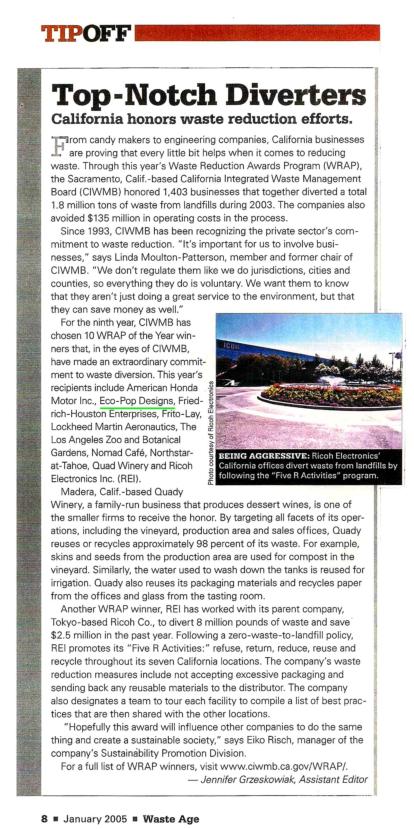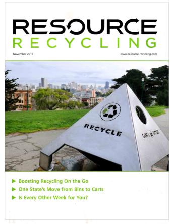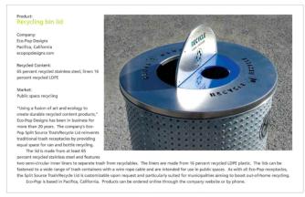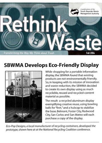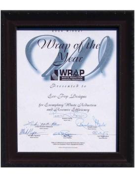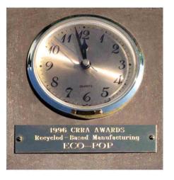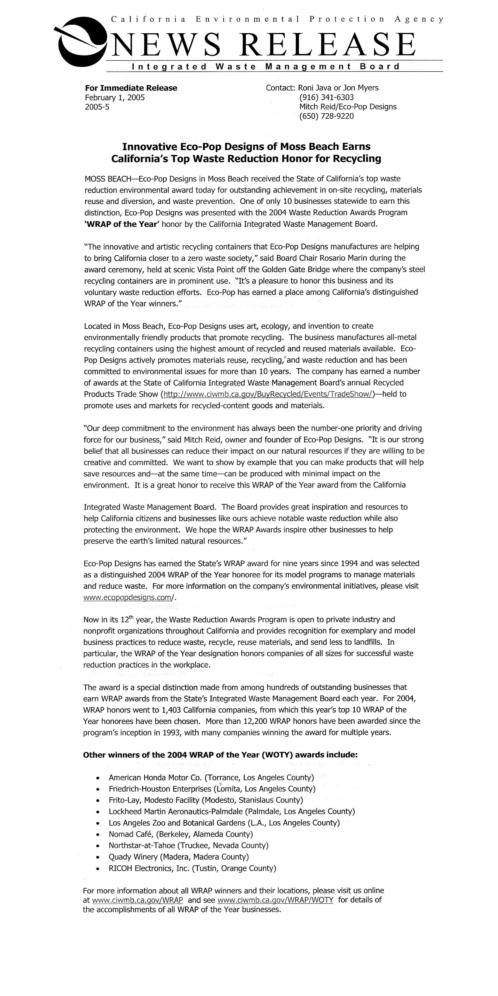 Cover Resource Recycling Magazine - April 2011Eco-Pop Designs Receives California’s Top Environmental Award !!!Awarded “ Most Creative”Awarded "Exhibition Best of Show" 2005 Awarded "Most Appealing" 2004 Awarded "Most Creative" 2003 Awarded "Greenest to the Bone" 2001Best Recycled Product Manufacturer 1996 California Resource Recovery AssociationA New Wave of Recycled Art and Design 1997-98 Traveling ExhibitionFeaturing Eco-Pop Designs’ Pyramid-Top Recycling ContainerOakland Museum of CaliforniaLos Angeles Municipal Art Gallery McAllen International Museum, McAllen, Texas Vancouver Museum, Vancouver, B.CCover of Resource Recycling Magazine - November 2013Resource Recycling Magazine - Products - March 2014